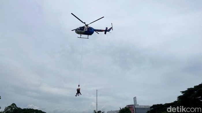 Unit K-9 diterjunkan untuk membantu mempercepat proses pencarian korban di lokasi yang sulit dijangkau. Sementara itu, helikopter milik kepolisian berputar di udara melakukan pemantauan situasi sekaligus menurunkan tim medis menggunakan tali fast-rope di area yang disimulasikan sebagai lokasi terdampak parah.